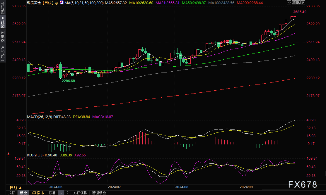 投资者正在等待周五公布的核心个人消费支出(PCE)物价指数。如果出现通胀回暖的迹象,则可能会打压美联储11月降息50个基点的预期,进而可能引发金价的回调行情,投资者需要预约警惕;目前市场预计美国8月PCE同比增速将由7月的2.6%上升至2.7%。