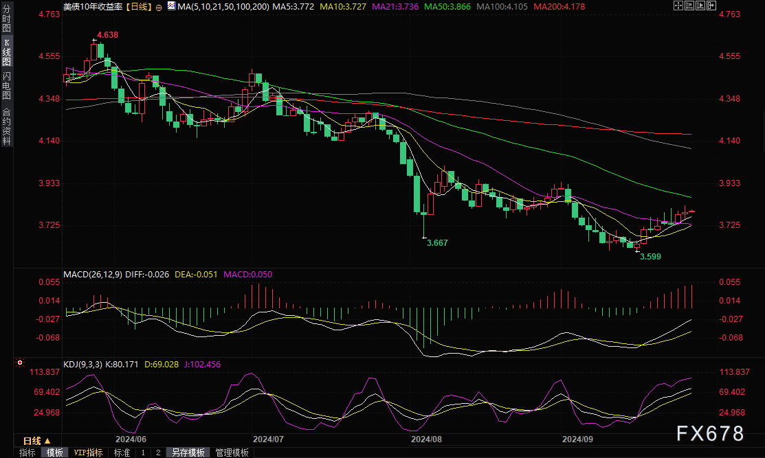 10年期国债收益率周四上涨0.8个基点,至3.789%,稍早触及3.821%的9月4日以来最高。