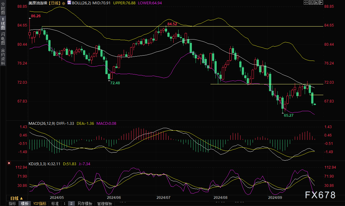 从技术面来看,美原油在8月21日低点71.46和布林线中轨阻力等关键位置附近受阻后持续回落,KDJ死叉良好运行,MACD红色柱萎缩,短线油价偏向空头,后市可能会试探9月10日低点65.27附近支撑,能否进一步下破还有待观察。上方留意5日均线69.34附近阻力,若能回升至该位置上方,则削弱短线看空信号。