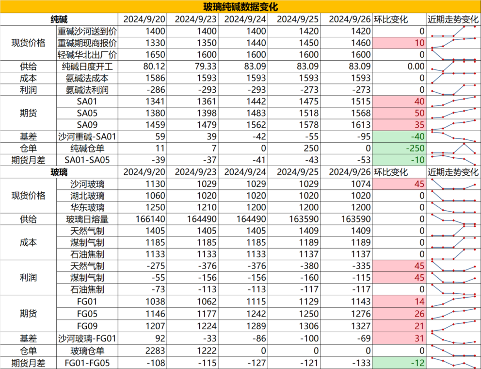 1. 当1. 当前沙河玻璃价格在1030元/吨左右,本周玻璃库存在7287.8万重箱,小幅去库2.55%,部分厂家小幅度提涨,目前当前政策端刺激无法再年内真正作用到玻璃需求端,对于短周期更多是情绪面影响,无法真正带动需求侧好转。供需端看,虽然供给端持续冷修,需求端部分厂家促销政策以及节前下游小幅补库带动产销好转,但整体基本面较前期改善不明显,按照现在的需求平推,10月累库边际会有所放缓,但库存高位仍难去化。