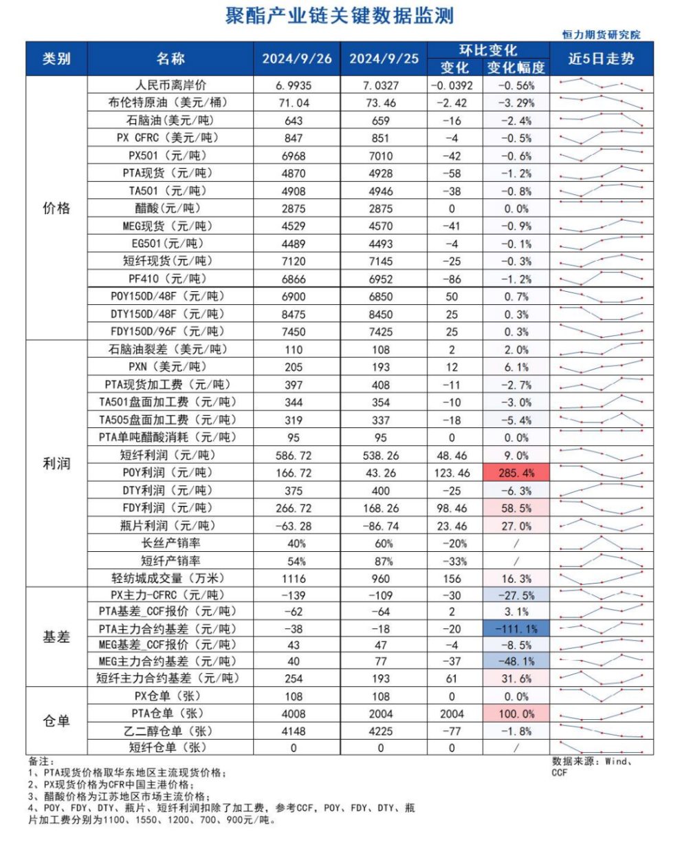 4、需求:PTA负荷上升3.9个百分点至79.4%,海伦石化120万吨PTA装置9月25日计划外短停;汉邦石化220万吨PTA装置9月15日附近因故停车,20日恢复;逸盛大连375万吨PTA装置9月18日降负至5成,26日开始提负;四川能投100万吨PTA装置2024年9月19日附近短停,9月24日附近重启;