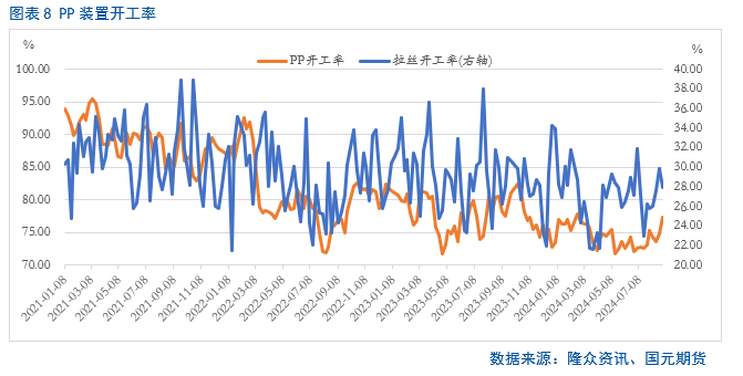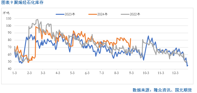 从石化库存来看,截至发稿,聚烯烃石化库存维持在82万吨,达到近年来同期高位,对盘面存在一定的压制。不过近期PE装置开工率持续走低,给与市场一定的利好支撑,但后期伴随着装置开工率大幅走高,供应压力增加。而PP装置开工率依旧持续走高,因此后期供大于求的局面难改。