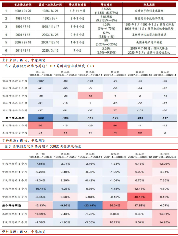 1984年以来美国共经历6轮降息周期:第一轮为1984年9月~1986年8月,历时23个月,降息幅度5.625%;第二轮为1989年6月~1992年9月,历时39个月,降息幅度6.8125%;第三轮为1995年7月~1998年11月,历时40个月,降息幅度1.25%;第四轮为2001年1月~2003年6月,历时29个月,降息幅度5.5%;第五轮为2007年9月~2008年12月,历时15个月,降息幅度5%;第六轮为2019年8月~2020年4月,历时8个月,降息幅度2.25%。