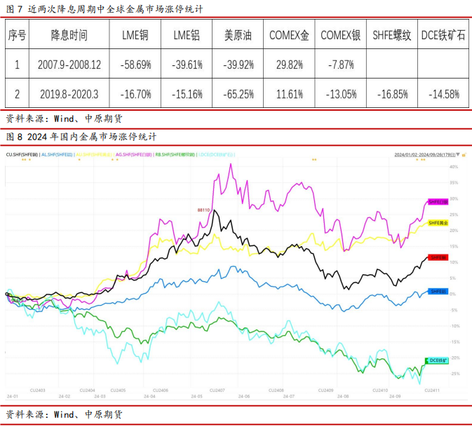 以铜为例,LME铜和COMEX铜都是以美元定价,因此美元涨跌会直接影响铜价波动,如果美元持续走弱,将会对铜价形成支撑。从中期来看,随着美联储开启降息周期,国内也会进行相应的货币宽松政策,宽松的资金环境有利于提振铜的需求。进入到降息周期后半段,如果美国发生“硬着陆”或者经济危机,铜价大概率也会承压走弱。另外,从铜的基本面来看,目前,铜矿供应偏紧,但电解铜产量处于历史高位,下游因铜价今年的大幅波动也受到一定冲击,虽然国内铜库存经历了一轮连续12周去库,但库存水平仍比去年同期高出一倍,降息对供需各个环节的影响很难一言以蔽之。另外,国内政策端的变化也是对铜价的重要影响因素。因此,单从美联储降息周期角度很难直接给出对铜价持续利多或是利空的判断,这一点在历史周期的统计中也有所验证。