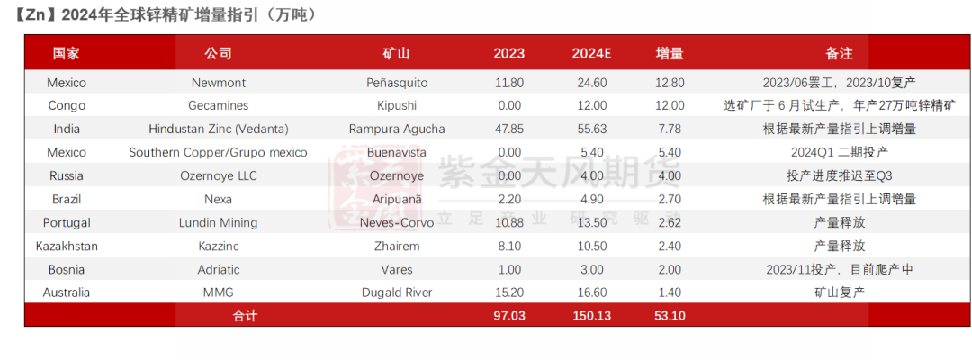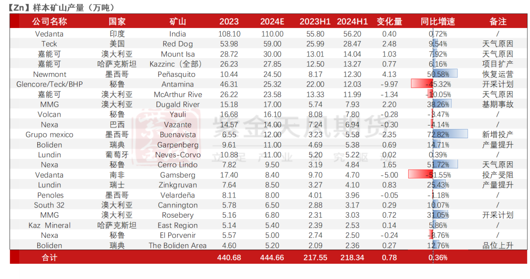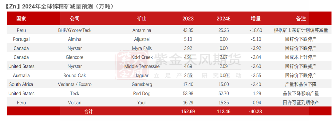 总体来看,Antamina贡献近20万吨减量,其他减量主要来自23年时锌价的下跌和矿山品位下行。