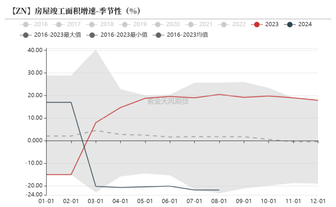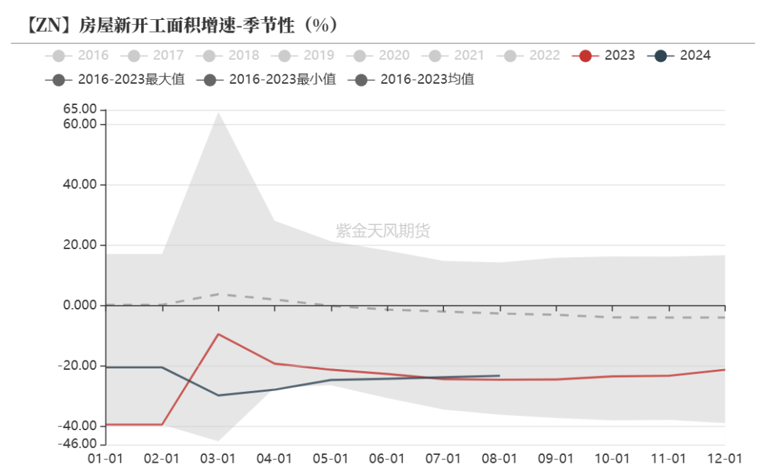 一般新开工领先竣工约3年,新开工累计同比增速自2021年7月转负,过去两年较差的新开工数据拉低今年的竣工需求,竣工累计同比增速或有下滑,房地产板块构成锌消费拖累项,下调24年全年房地产竣工增速至-15%,锌板块耗锌增速为-6%。