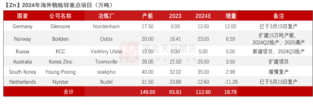 消费方面,炼厂投产受限减产检修,预计24年锌锭产量同比减少50万吨,预估2024年全球矿端短缺26万吨;