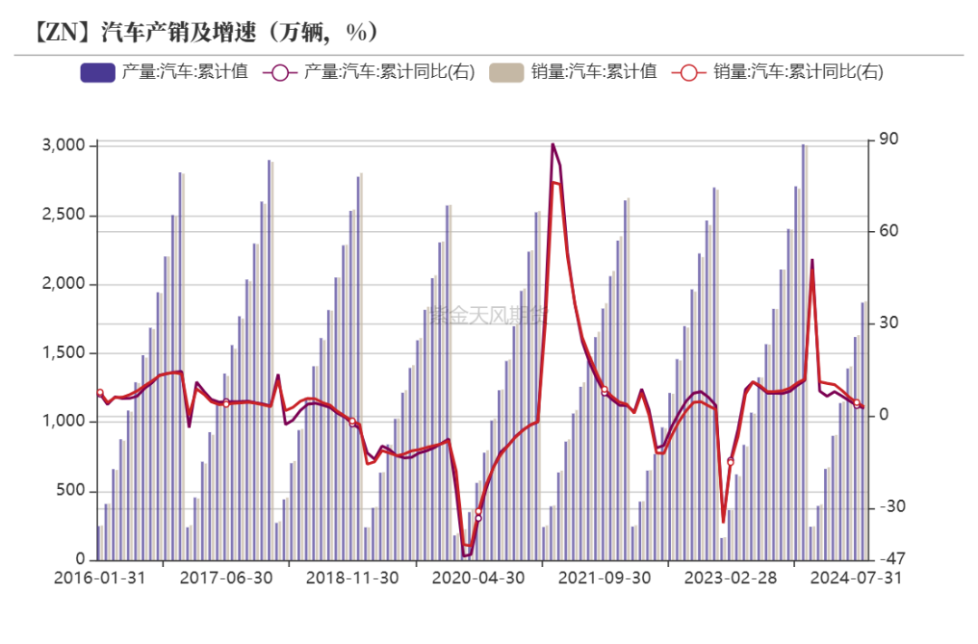汽车板块用锌变化不大,尽管汽车产量有所增加,但铝代镀锌钢的使用愈加频繁。