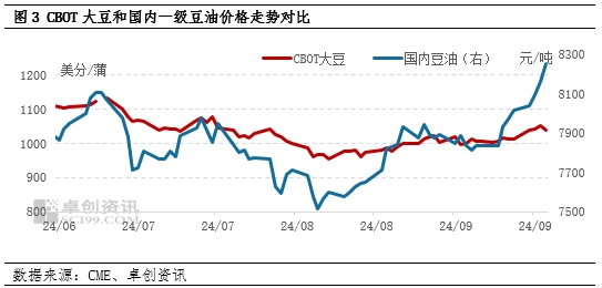 从8月底以来,巴西大豆产区天气一直是市场关注热点,尤其进入9月播种季,产区天气持续干旱影响到播种进度,目前播种仅限于帕拉纳州和马托格罗索州,目前大豆播种进度仅为预期总面积的0.06%,而去年同期为0.15%。据巴西自然灾害监测预警中心当地时间9月25日数据显示,截至9月22日,2024年巴西有超一千个城市发生严重干旱,连续三个月未有明显降水,约占巴西城市数量总数的五分之一;约600座城市连续超过130天无明显降水。戈亚斯州、米纳斯吉拉斯州和马托格罗索州是受影响最严重的地区。其中马托格罗索州是巴西最大的大豆产区,大豆产量占比巴西总产量的26%,所以该地区的干旱情况对全球大豆及豆油价格产生利多支撑,推动9月豆油价格整体走高。