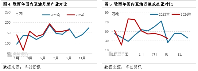 国内豆油产量整体维持高位,但成交情况相对清淡。据卓创资讯统计,截至9月26日,当月豆油成交量34.52万吨,较上月同期提高2.94万吨。成交量相对产量提升幅度有限,所以豆油整体呈现供略大于求的局面,在一定程度制约了豆油现货价格涨幅。