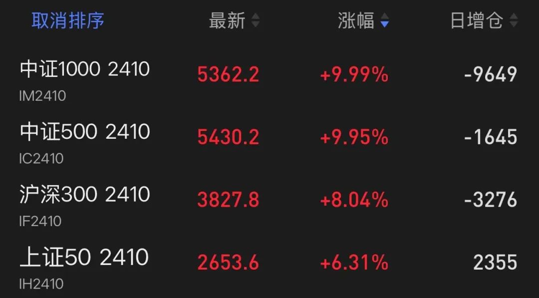 除了借道ETF,投资者还涌入股指期货,沪深300、中证500、中证1000股指期货主力合约盘中均一度冲击涨停,涨幅远远超过相应指数的涨幅。上证50股指期货主力合约盘中也一度涨超9%,截至收盘涨幅略有回落,但仍大涨6.31%,超过上证50指数涨幅的1倍多。
