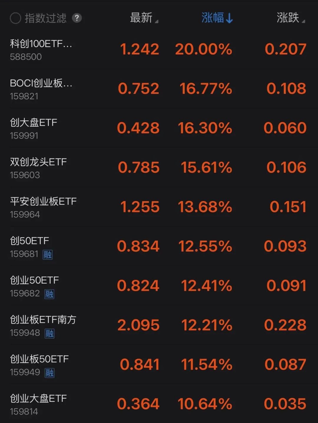 深市交易含沪市个股的ETF因此全线大涨,创科技ETF上市以来首次20%涨停,成交较前一交易日激增500%以上,沪深300ETF、中证500ETF、中证1000ETF等盘中均一度触及涨停,成交量也是较前一交易日激增数倍。