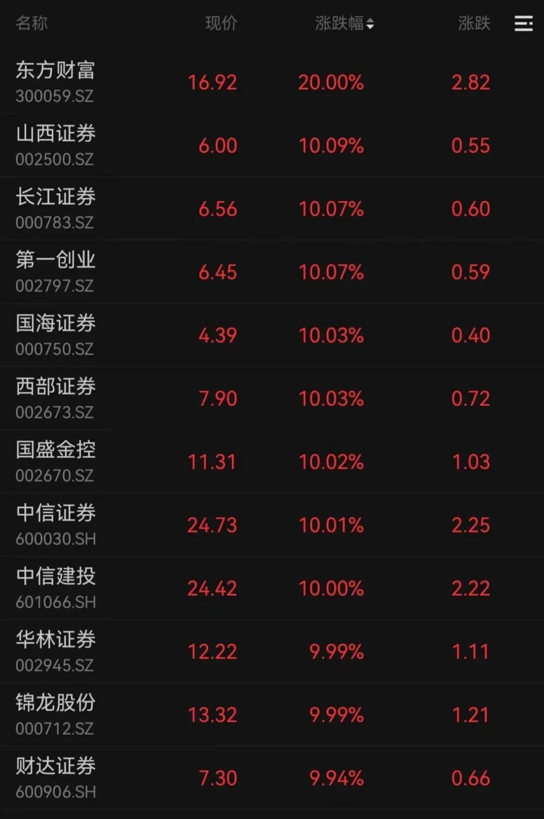 作为“牛市旗手”的券商股也群起上攻,板块指数周五飙升8.55%,全周合计大涨23.48%。东方财富20%涨停,周涨幅高达57.25%,山西证券、第一创业、长江证券、西部证券等超10股涨停。