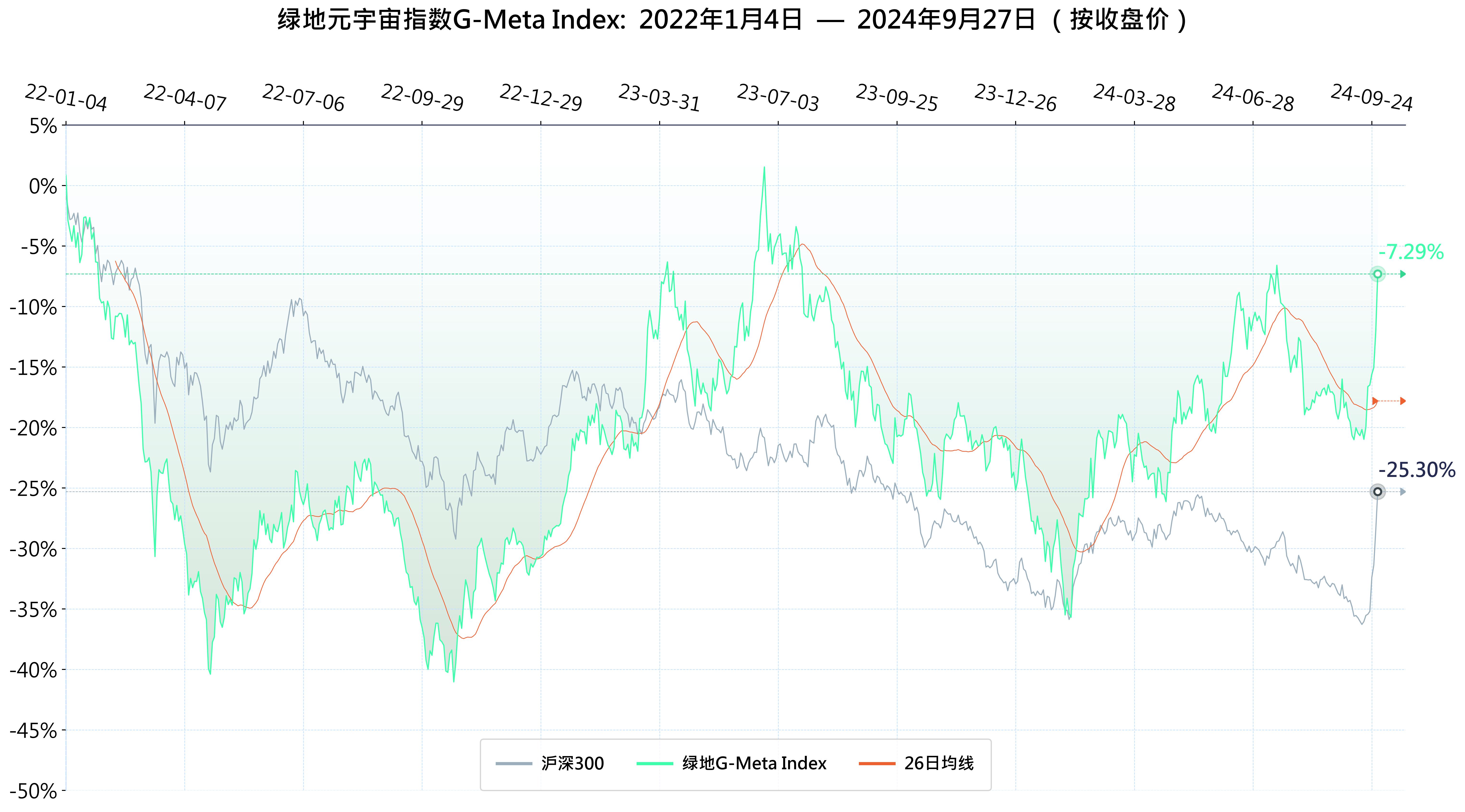 上证报中国证券网讯(记者 刘怡鹤)本周(9月23日-27日)绿地元宇宙指数G-Meta Index最高4596.4点,周五收于4596.4点,较上周五上涨11.18%;同期沪深300上涨15.7%,创业板指上涨22.71%。本周绿地元宇宙指数跑输沪深300,相对收益为-4.52%。