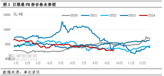 三季度铁矿石价格偏弱运行,日照港PB粉均价754元/吨,最高点7月初855元/吨,最低点9月下旬667元/吨。三季度,海内外宏观环境与黑色基本面交替因素相互影响,对市场情绪及价格产生显著影响。7-8月份经济数据不佳,投资增速回落,地产和消费持续磨底,制造业景气度持续位于荣枯线以下;而美国经济降温,海外市场在交易衰退和交易降息之间经历了好几轮反复,对国内资本情绪也有较大影响。因此在终端需求低迷、宏观情绪悲观的大背景下,商品市场出现共振式下跌,叠加旧标螺纹集中出货带来的冲击,黑色盘面出现不同程度回落,原料端也有所下行。9月底国内政策窗口开启,降准降息以及地产相关政策集中落地,引发资本市场情绪好转,借助政策暖风,市场信心有所提振,带动期现市场价格有所反弹。