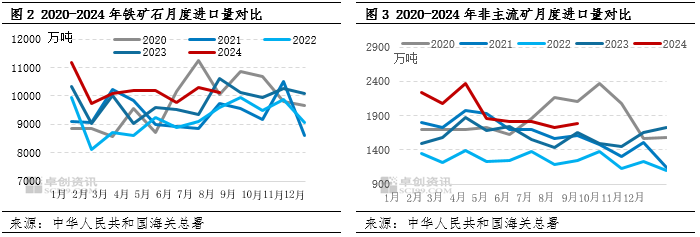 2024年以来铁矿石供应表现宽松,一方面,海外需求恢复缓慢;另一方面,矿山在利润驱动及国内需求支撑下,主流矿发运稳中有增,非主流矿发运明显增长。海关总署数据显示,1-8月中国累计进口铁矿砂及其精矿81495.2万吨,同比增长5.2%,高于近五年同期高位,其中除2月份跟6月份之外,铁矿石单月进口量均超过1亿吨,而非主流矿增量较明显,同比增幅达到20.39%。从全球发运量看,今年3季度供应维持高位,期间虽有台风天气的扰动,但铁矿石发运到港量维持稳定增长,进入9月份后,矿价虽继续回落,但供应端却同环比继续增加,尤其主流矿的发运量改善明显。