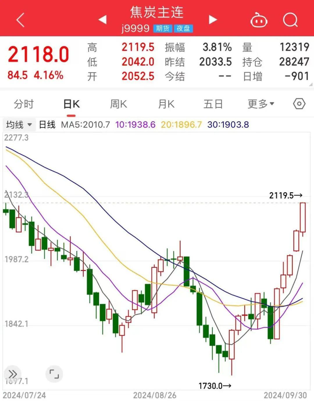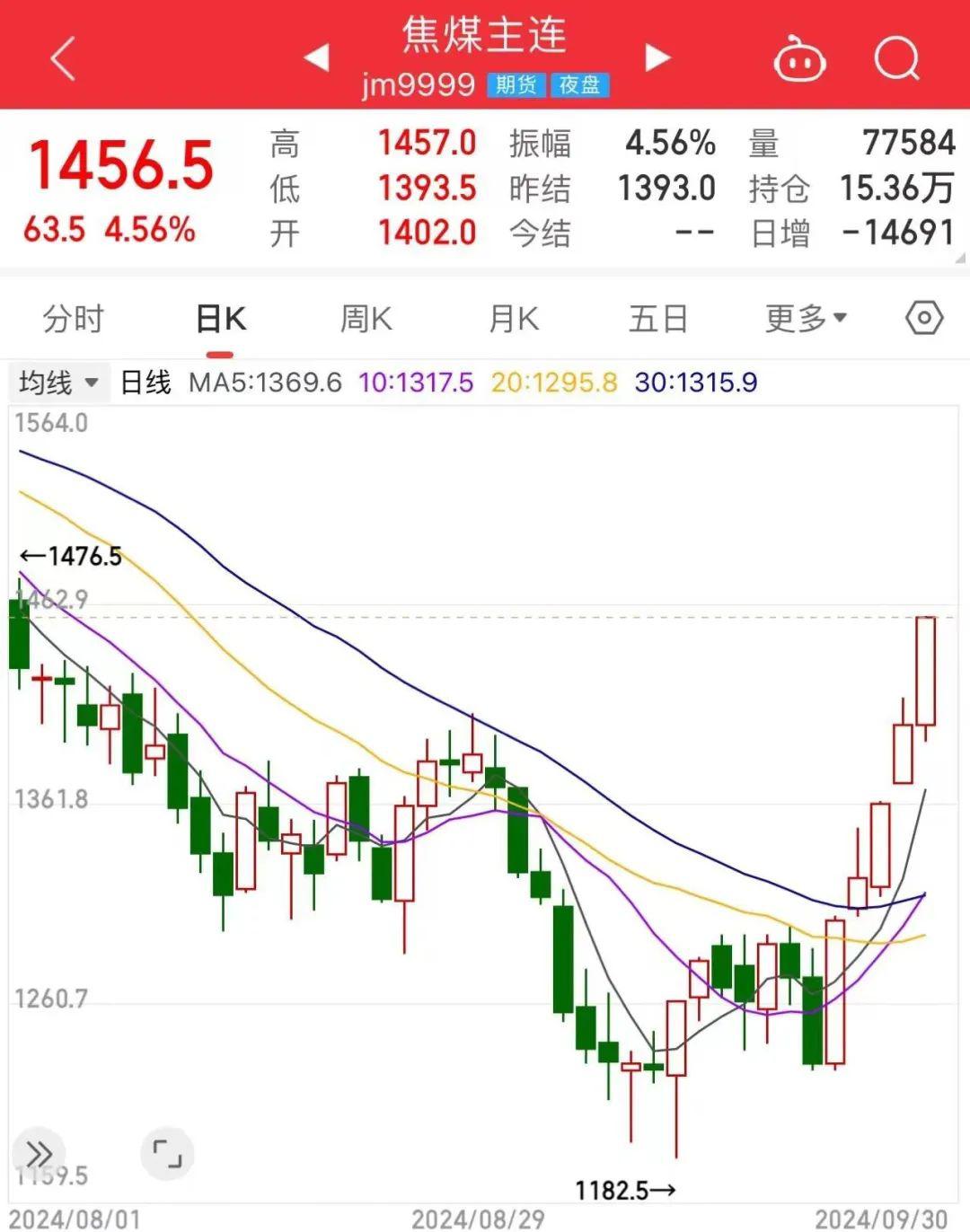 受多个重磅利好消息影响,房地产股和黑色系期货应声大涨。热轧卷板期现价格显著上涨,螺纹钢、焦煤和焦炭录得“五连阳”,均抹去8月以来全部跌幅。