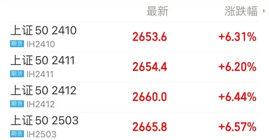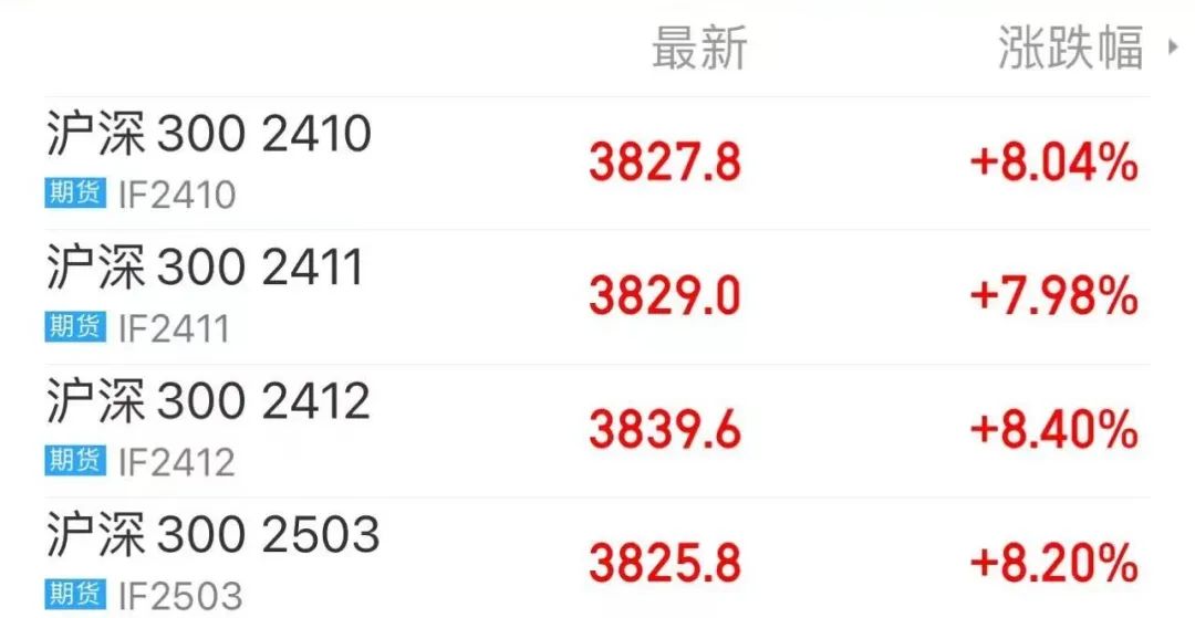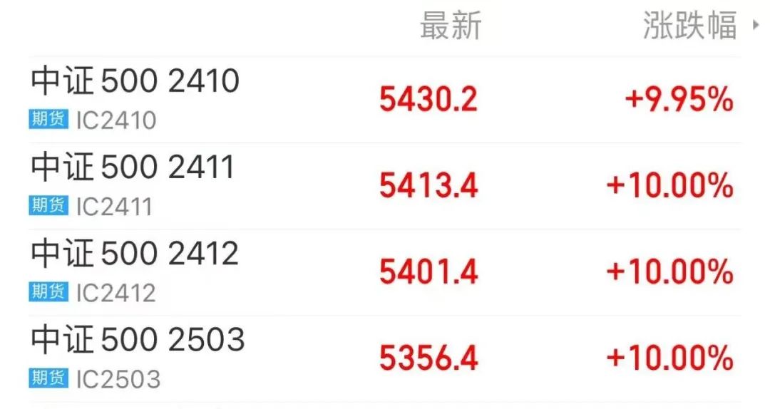 股市上涨也带动了股指期货市场行情,截至周五收盘,上证50期指主力合约大涨6.31%,沪深300股指期货主力合约大涨8.04%,中证500股指期货主力合约暴涨9.95%,带动远期合约IC2411、IC2412、IC2503涨停收盘。中证1000股指期货主力合约触及涨停,远期合约IM2411、IM2412、IM2503均涨停。