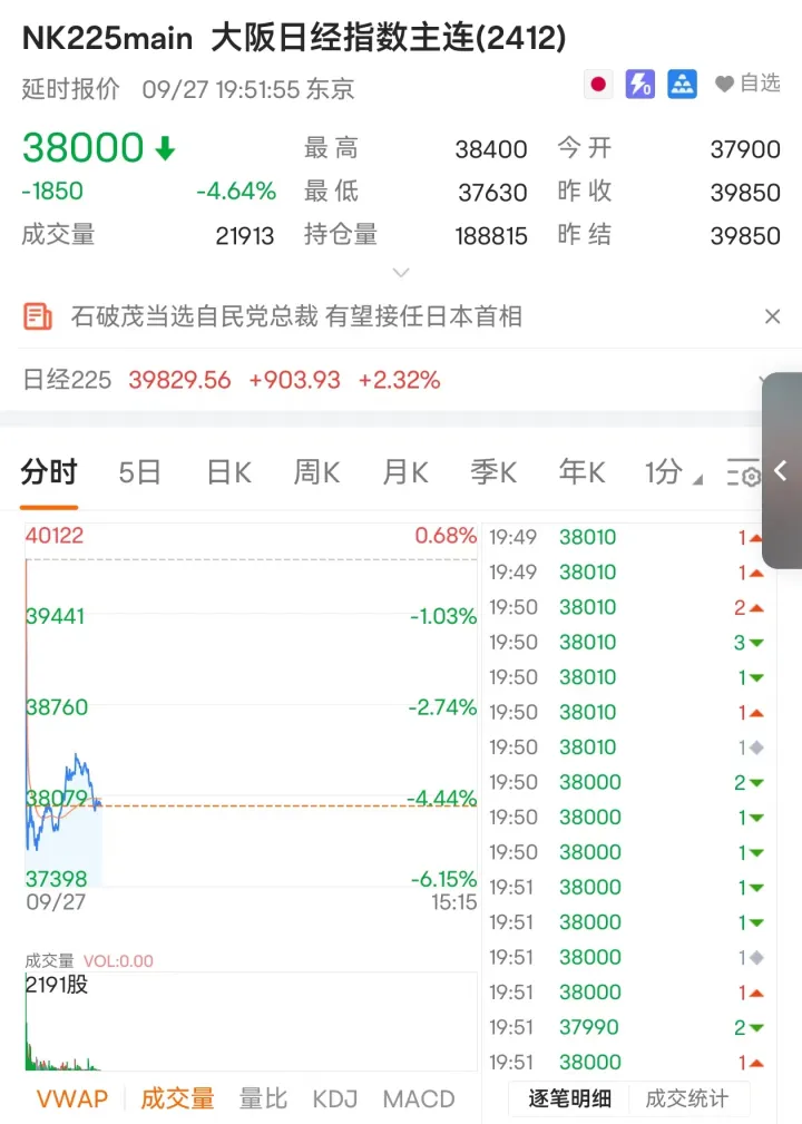 当地时间27日傍晚,在石破茂当选日本自民党新总裁后,日经225指数期货交易盘中一度大跌2220点,并触发熔断机制,最高跌幅达到5.6%。