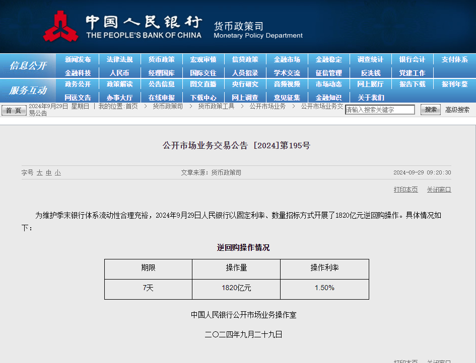 中国人民银行9月29日公告称,为维护季末银行体系流动性合理充裕,以固定利率、数量招标方式开展了1820亿元7天期逆回购操作,操作利率为1.50%。