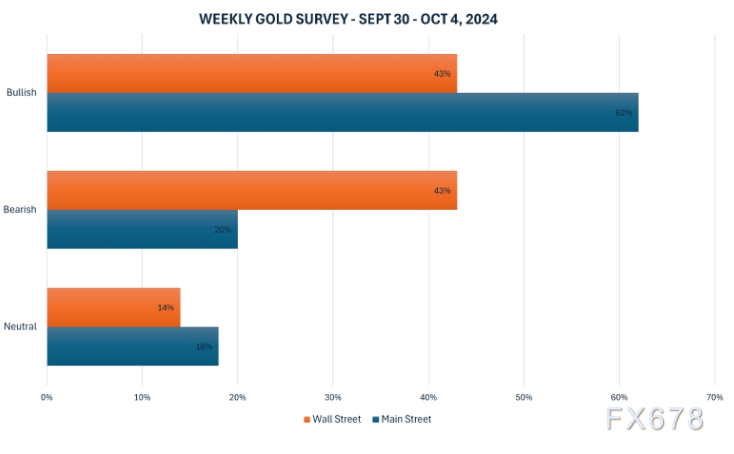 在Kitco News的黄金走势调查中,共有14名分析师参与,调查结果显示华尔街的分析师对黄金的看法分裂。43%的分析师看涨,43%看跌,剩下14%认为黄金将横盘整理。而在Kitco的在线调查中,192名散户投资者参与了投票,其中62%预期黄金价格将上涨,20%预期下跌,剩余17%认为黄金价格将保持横盘。