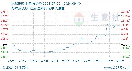 9月30日,生意社天然橡胶基准价为17063.00元/吨,与本月初(15146.00元/吨)相比,上涨了12.66%。