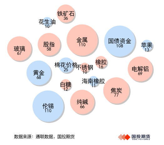 我们统计了近一周市场中热度较高的新闻/报告中与期货市场存在相关度较高的关键词,其中气泡大小反应关键词出现频率,气泡颜色代表关键词对应新闻/报告的情感分类,蓝色为负面,红色为正面。