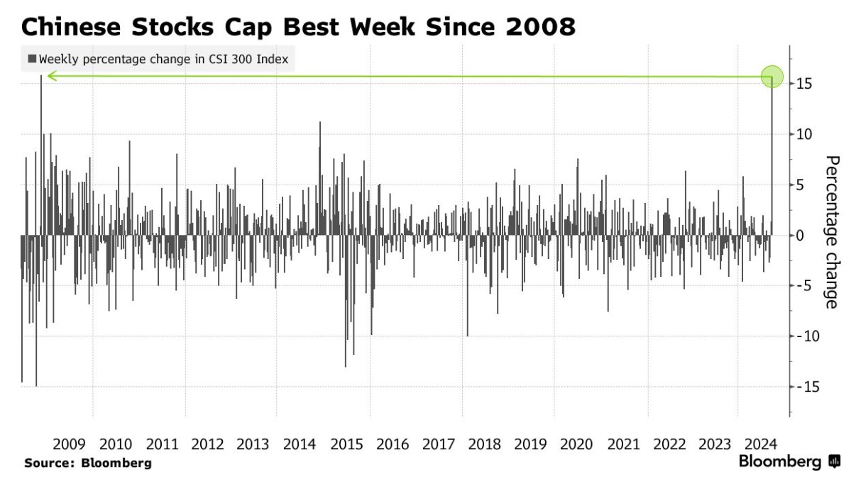 政策放松措施推动沪深300指数上周创下2008年以来最大涨幅,但在美国银行9月份对全球基金经理的调查中,19%的受访者表示“做空中国股票”是最受欢迎的交易之一。