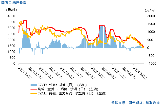 三季度纯碱和玻璃盘面均走出流畅性下跌行情。纯碱2501合约从2068元/吨跌至9月25日的1475元/吨,环比下跌28.7%,玻璃2501合约跌至1129元/吨,环比下跌27.5%。