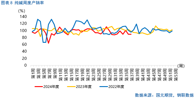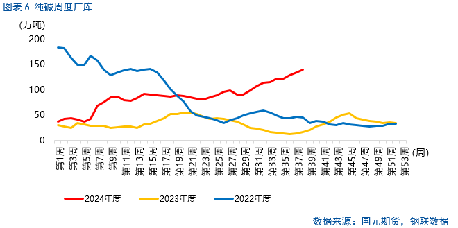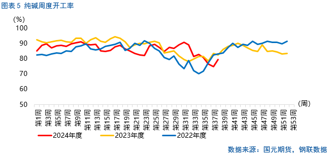 今年纯碱检修季相较于往年同期略有推迟。7月有少量碱厂进行夏季检修,部分碱厂推迟检修至8月之后,不过纯碱产量始终居于近三年同期高位。 截至9月20日,纯碱日度产能利用率在80.26% ,比7月初减少了2.2个百分点。中长期碱厂检修计划暂不明确,关注重庆40万吨纯碱情况;此外,河南以及连云港总计有200万吨/年纯碱产能计划2024年内投产,因此我们认为,四季度纯碱供应端仍将维持高位,不过建议关注是否存在新增碱厂检修公告。