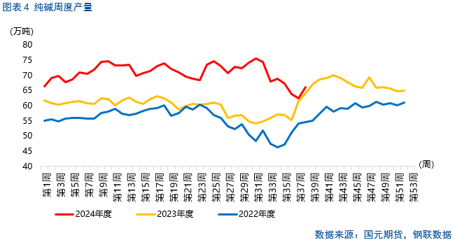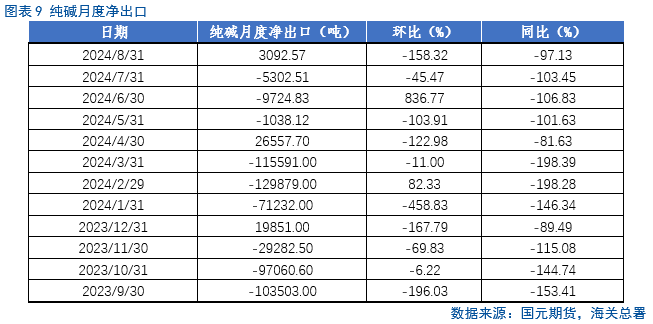 三季度浮法玻璃供应下滑,因此对重碱需求下滑。截至9月23日,浮法玻璃日度开工率在79.26%,比7月初下滑4.18个百分点,日产量在16.45万吨,比7月初下滑3.43个百分点。四季度浮法玻璃供应是否兑现下滑将仍为市场主要交易逻辑,当然,近日宏观政策频出,也应格外注意国内外政策动向。