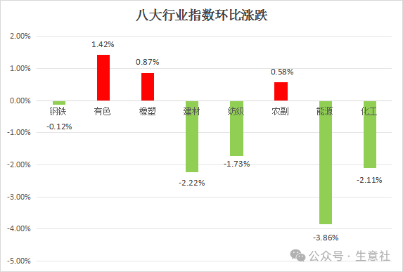 个行业,本周涨多跌少,上涨前三的分别是钢铁行业,涨幅为2.83%,有色行业,涨幅为1.85%,橡塑行业,涨幅为0.72%;下跌的是化工行业,跌幅为-0.83%。