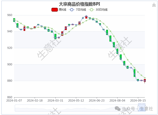 9月28日大宗商品价格指数BPI为882点,较周初上升了3点,较周期内最高点1343点(2021-10-19)下降了34.33%,较年内最低点877点(2024-09-24)上涨了0.57%。