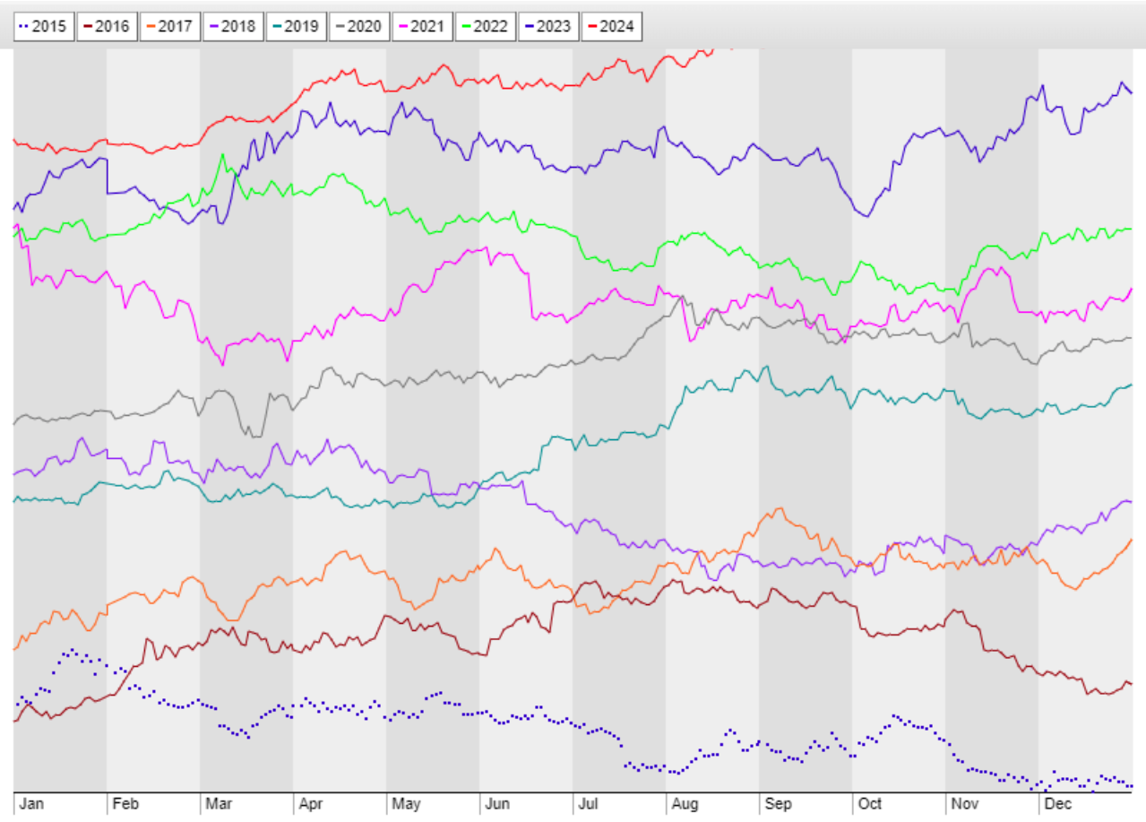 据观察,10月收盘价高于开盘价的概率为56%。然而,价格图通常显示出盘整模式。由于2024年9月表现强劲,10月上半月价格强劲上涨,随后出现价格调整,这可能在2024年第四季带来风险。因此,2024年最后一季(10月或11月)可能会出现调整,但这次价格调整可能会导致2024年12月及次年价格强劲上涨。