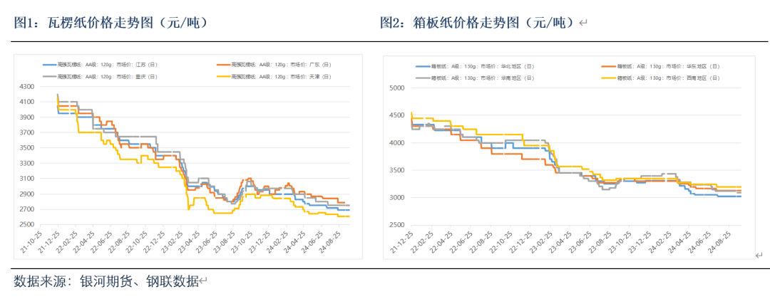 9月瓦楞及箱板纸市场需求旺季表现疲软,均价环比下滑。上旬市场供需基本平衡,而中下旬随着中秋订单结束,需求减少导致消费量下滑,供需压力逐步扩大,利空价格运行。