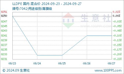 据生意社商品行情分析系统监测,LLDPE(7042)9月23日国内价格在8250元/吨,9月27日均价在8241元/吨,期间报价下跌0.10%。