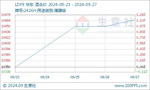 据生意社商品行情分析系统监测,LDPE(2426H)9月23日国内价格在10350元/吨,9月29日均价在10466元/吨,期间报价上涨0.13%。