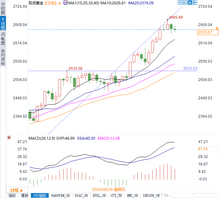 对于短期走势,Mehta认为,若多头重新回归,2674美元/盎司将是黄金的第一个重要阻力位,突破后纪录高位2686美元/盎司也将随之面临考验。技术上看,若金价能强势突破这一高位,下一目标将上探至2700美元/盎司,甚至是2710美元/盎司的上升趋势线阻力位。