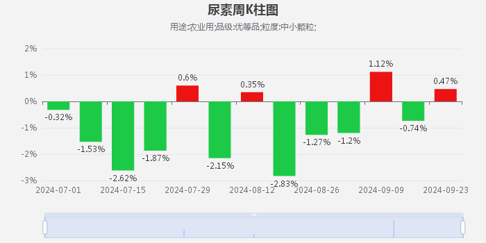 根据2024年7月1日-2024年9月23日周K柱图可以看出,国内硫酸铵周期内涨跌互现。9月上涨较多,最大涨幅在9月9日当周为1.12%。