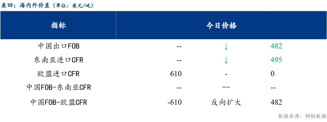 从海内外价差情况来看,中国热卷出口在482美元/吨,较上一交易日稳;欧盟进口价格610美元/吨,较上一交易日稳 。