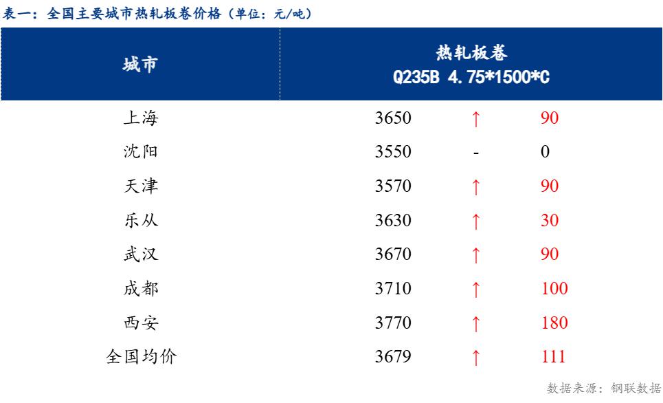 截止发稿时4.75热轧板卷全国均价3679元/吨,较上一交易日上涨111元/吨。其中主要城市价格为上海3650元/吨,沈阳3550元/吨,天津3570元/吨,乐从3630元/吨,武汉3670元/吨,成都3710元/吨,西安3770元/吨。