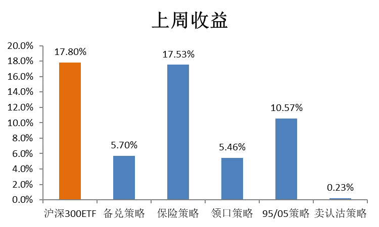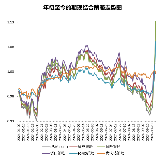 我们对期现结合的五个策略(备兑、保险、领口、95/05配置、卖认沽)及沪深300ETF现货,在上周(2024.9.23-2024.9.27)的表现进行了回测。上周沪深300ETF大涨,保险策略、领口策略、卖认沽策略所涉认沽期权已深度虚值,国债ETF回调影响了95/05策略和卖认沽策略的收益。具体结果如下: