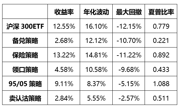 备兑、保险、领口策略建仓及调仓方法:组合基日为2023年1月3日,以收盘价买入1万份300ETF现货,备兑策略以收盘价备兑卖出开仓1张当月虚值5%的认购合约,保险策略以收盘价买入开仓1张当月虚值5%的认沽合约,领口策略以收盘价买入开仓1张当月虚值5%的认沽合约并备兑卖出开仓1张当月虚值5%的认购合约。此后在每个月期权合约到期日前一周的最后一个交易日进行调仓,以收盘价平仓已持有的期权合约,并以收盘价建仓相应的下月合约。ETF分红等事件出现时,使用获得的红利买入ETF进行再投资,保持期权合约对应的ETF份数和持有的ETF一致。旧合约仍持有到期,不向新挂牌合约展期。当保险策略和领口策略所持期权收益率超过50%时,期权进行止盈平仓。