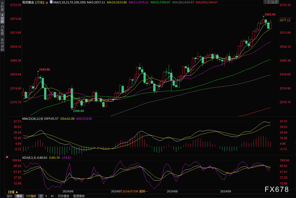 现货黄金周二收盘上涨1.09%至2663.62.美元/盎司,上周四曾创下2685.42美元的历史新高。美国黄金期货收盘上涨0.9%至每盎司2690.3美元。