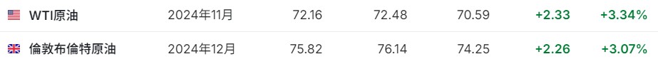 3. 截至发稿,WTI原油涨3.34%,报72.16美元/桶。布伦特原油涨3.07%,报75.82美元/桶。