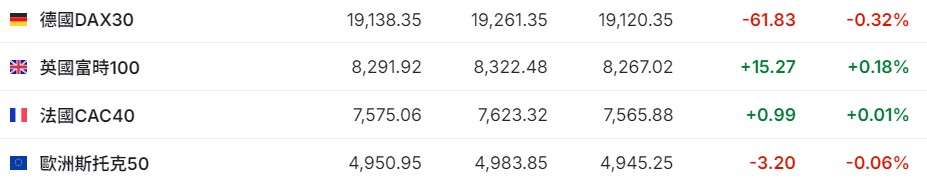 2. 截至发稿,德国DAX指数跌0.32%,英国富时100指数涨0.18%,法国CAC40指数涨0.01%,欧洲斯托克50指数跌0.06%。