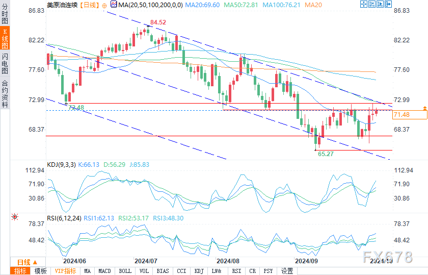 WTI原油期货价格正在触及71.46美元的阻力位,这也是9月24日和25日测试受阻的水平。如果中东局势没有进一步升级,这种风险溢价交易可能会迅速平仓,油价有可能回落至67.11美元。