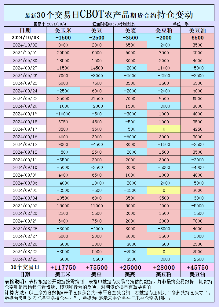 增加CBOT玉米投机性净空头;增加CBOT大豆投机性净空头;增加CBOT小麦投机性净空头;增加CBOT豆粕投机性净空头;增加CBOT豆油投机性净多头。