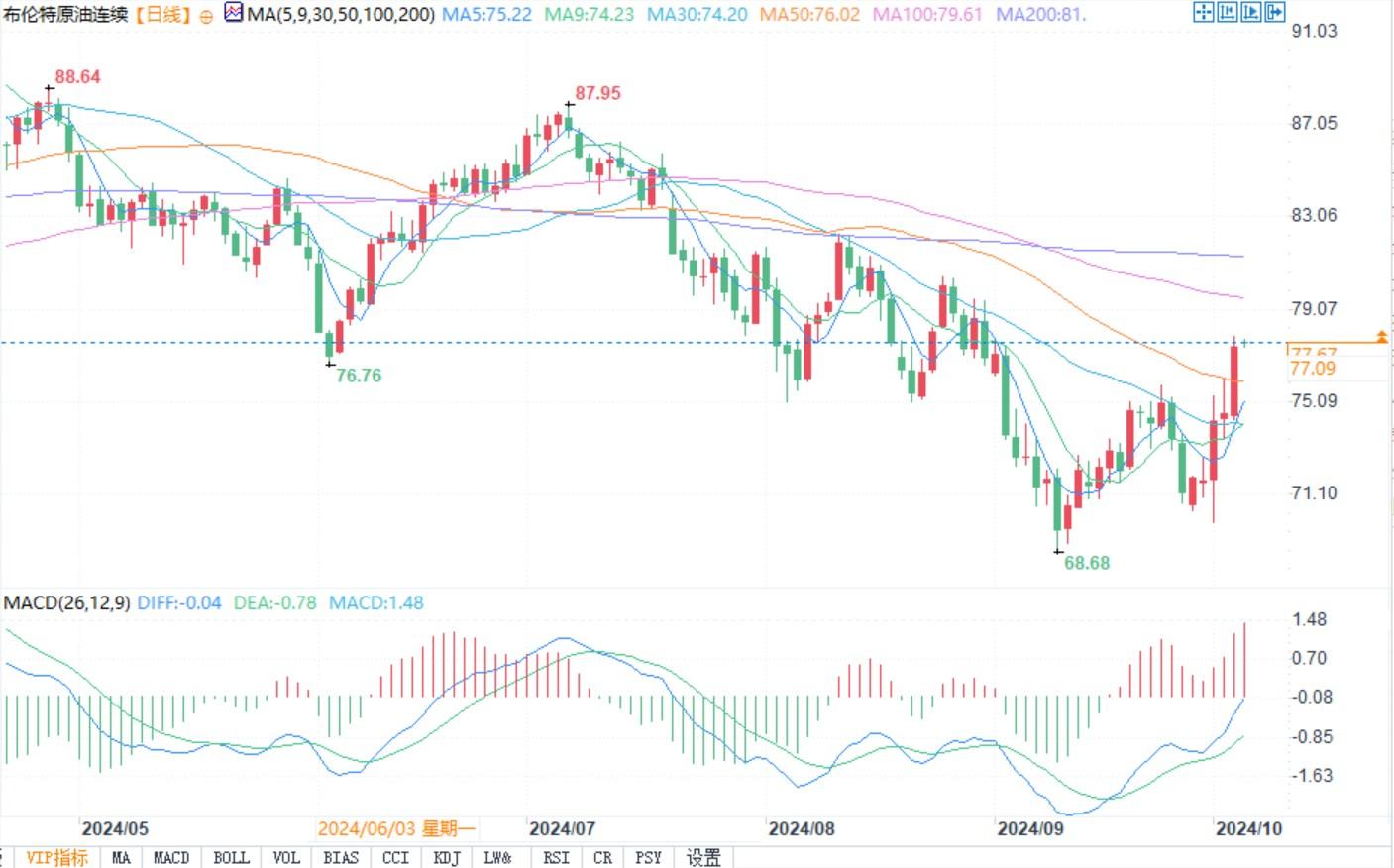 北京时间10月4日11:03,布伦特原油价格报77.67美元/桶