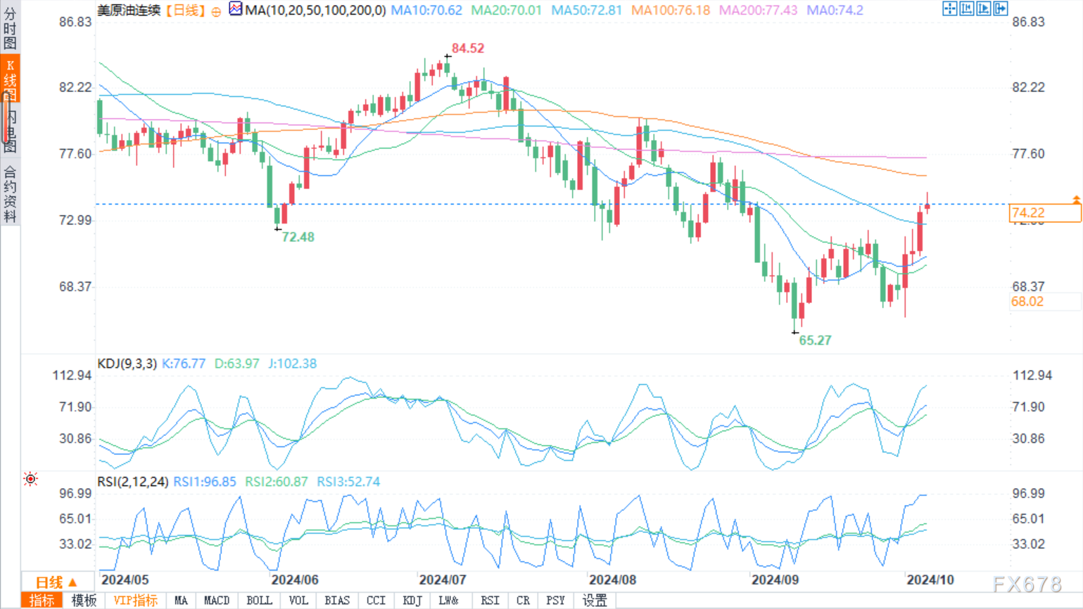 WTI原油价格走势让技术分析师们忙于工作,一个又一个的关键水平被突破。周四,价格突破55天简单移动平均线(SMA)72.77美元。尽管75美元仍是一个遥不可及的目标,但如果以色列得到美国的允许,攻击石油设施,油价可能会达到这一水平。